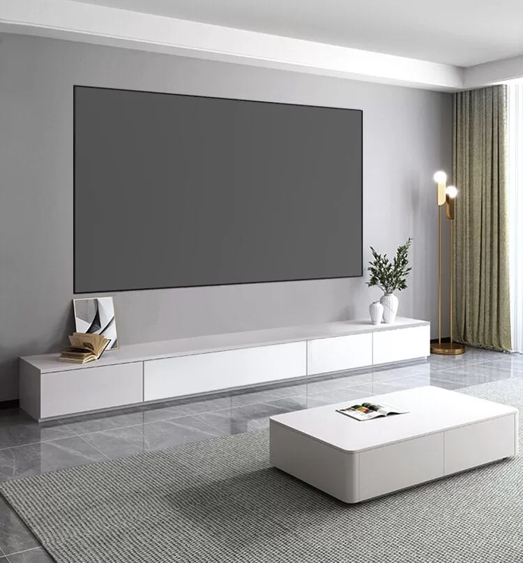 ● Narrow frame screens are made of a variety of materials: including high-definition PVC soft screens.Nano 4K white soft.Microporous sound-transmiƫng screens, 4K silver fabric,4K metal microporous sound-transmiƫng screens.Ambient light rejecting fabric, etc. These materials can be selected according to different usage environments and needs. For example, when the ambient light in the living room is strong, you can choose an anti-light screen, and an independent audio-visual room can choose an acoustic screen.