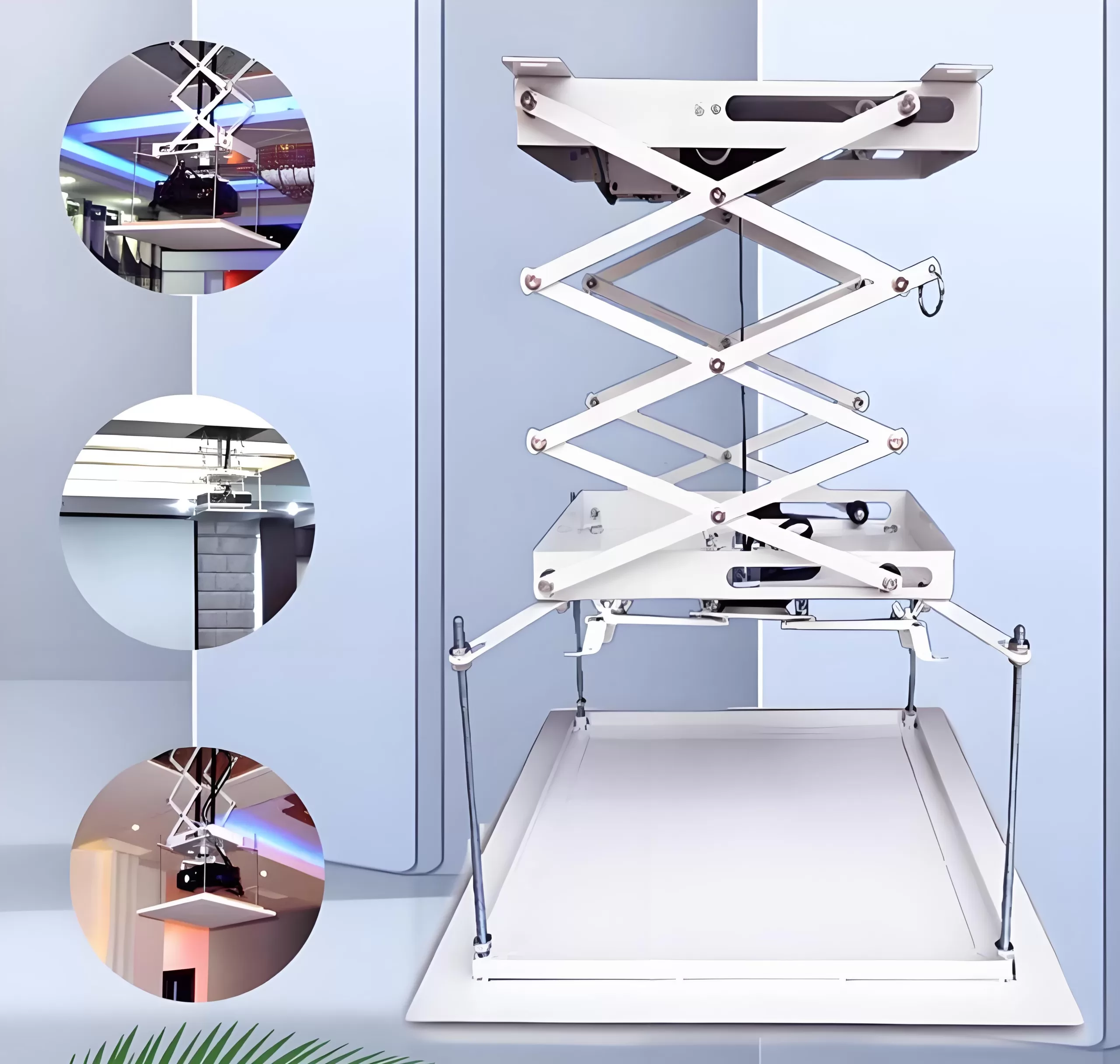 Ultra-thin projector lift is a designed for limited ceiling space to install projectors. Its main feature is to fix the projector on the ceiling and realize lifting and adjusting the angle by electric means for easy use and storage. ‌ This lift has an ultra-thin design,which is designed to save space and keep the indoor environment clean and beautiful ‌